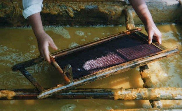 traditional way, using mulberry fibres and a dipping mould and screen to form the sheets